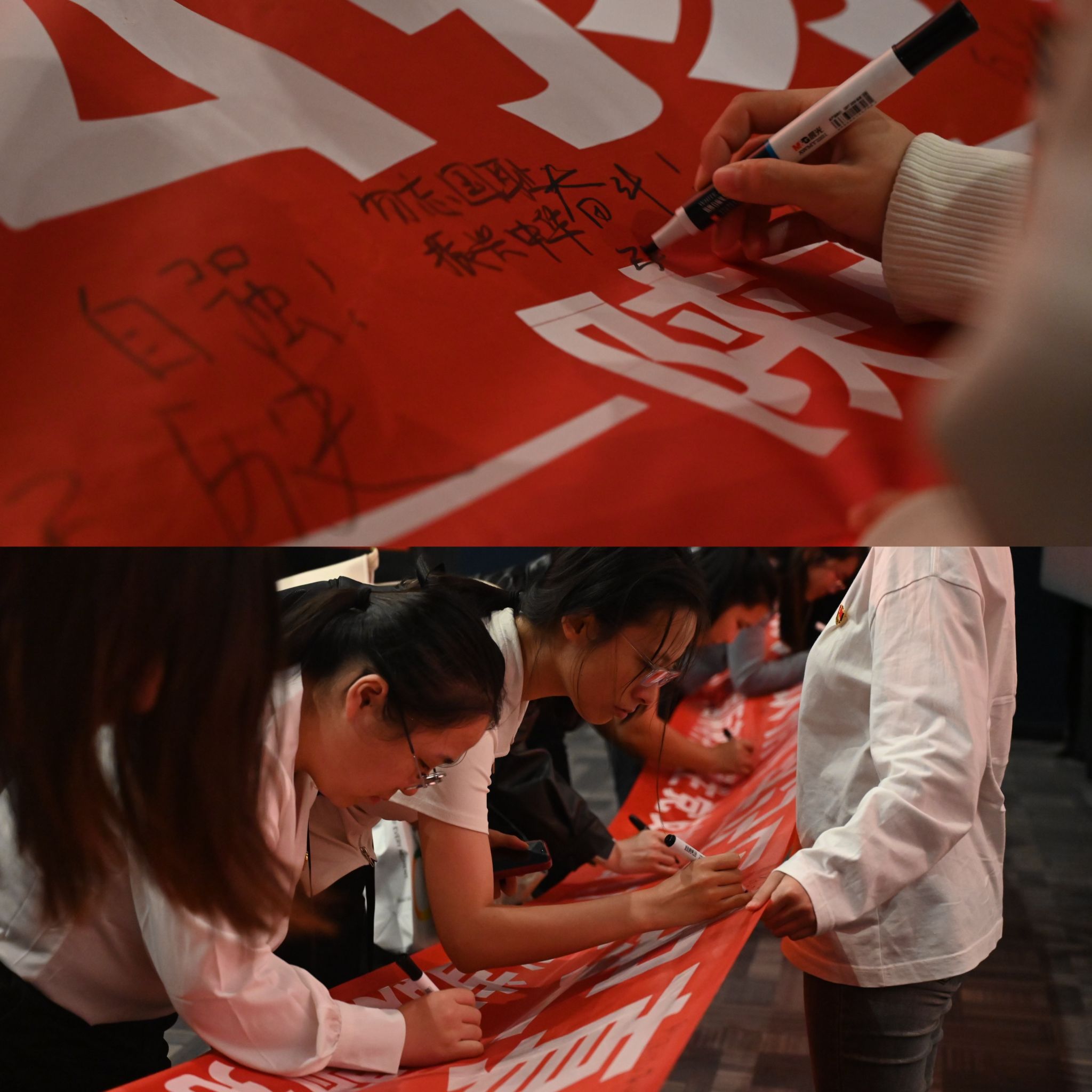 活动最后,全体党员在横幅上写下观影感悟并合影留念。大家纷纷表示,铭记历史是为了避免悲剧重演。尽管我们身处和平年代,但国际形势依旧复杂多变,面临诸多挑战与威胁,应当让以史为鉴、奋勇前行成为每一位党员的思想自觉与行动自觉。